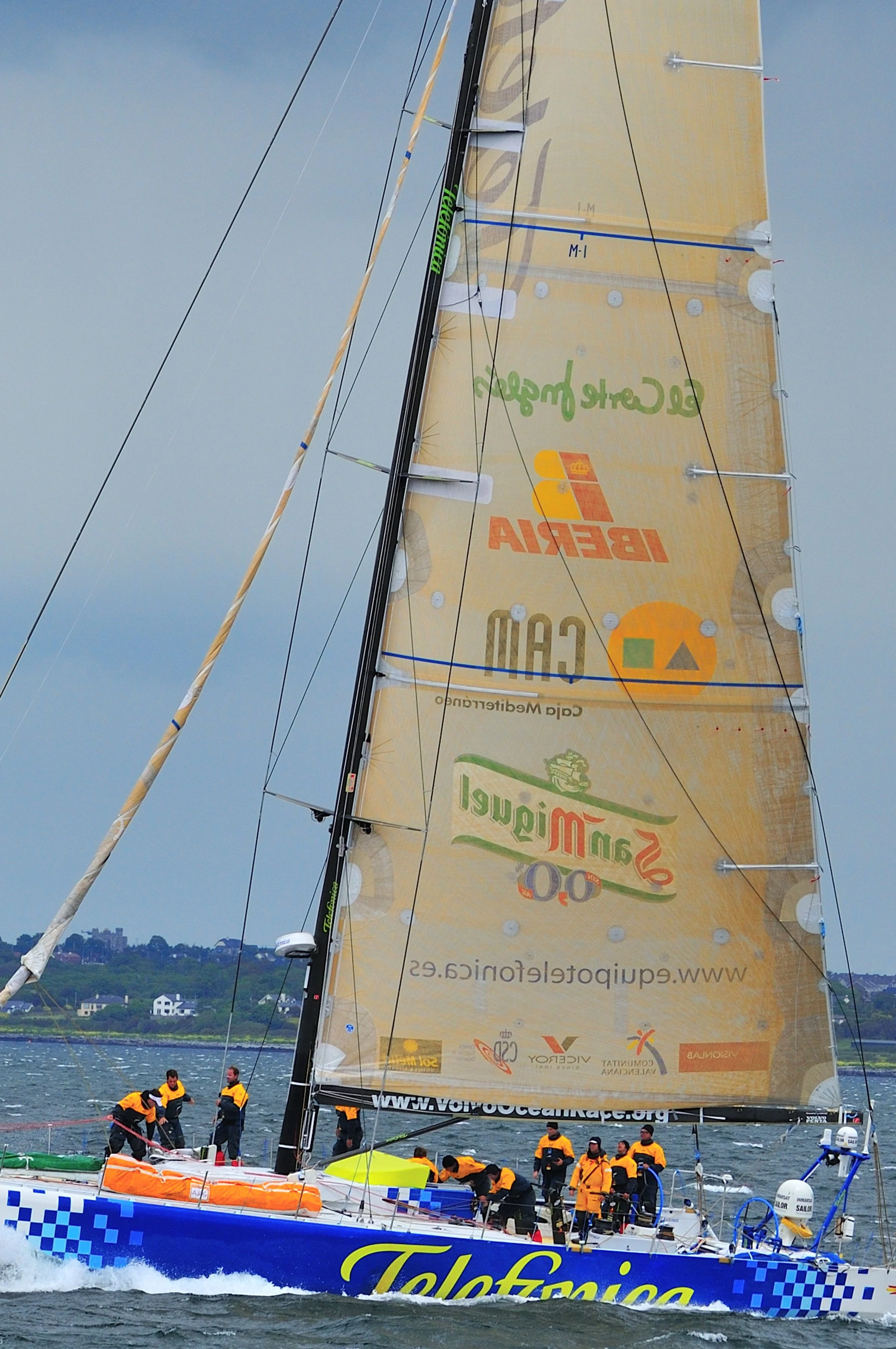 GREEN DRAGON, sailing for Ireland and China, leads Telefonica as it rounds the turn.