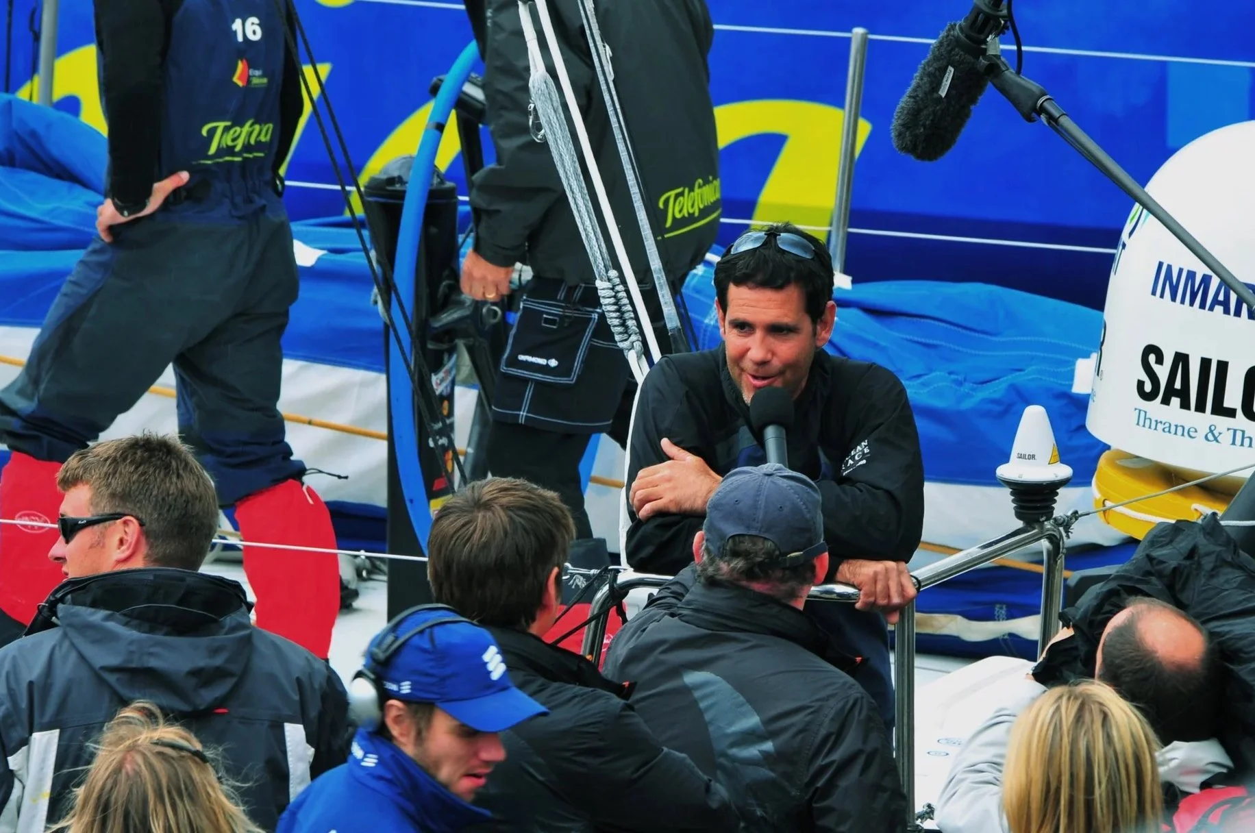 Skipper, FERNANDO ECHÁVARRI of Team Telefonica Blue, speaks to the press before race time.