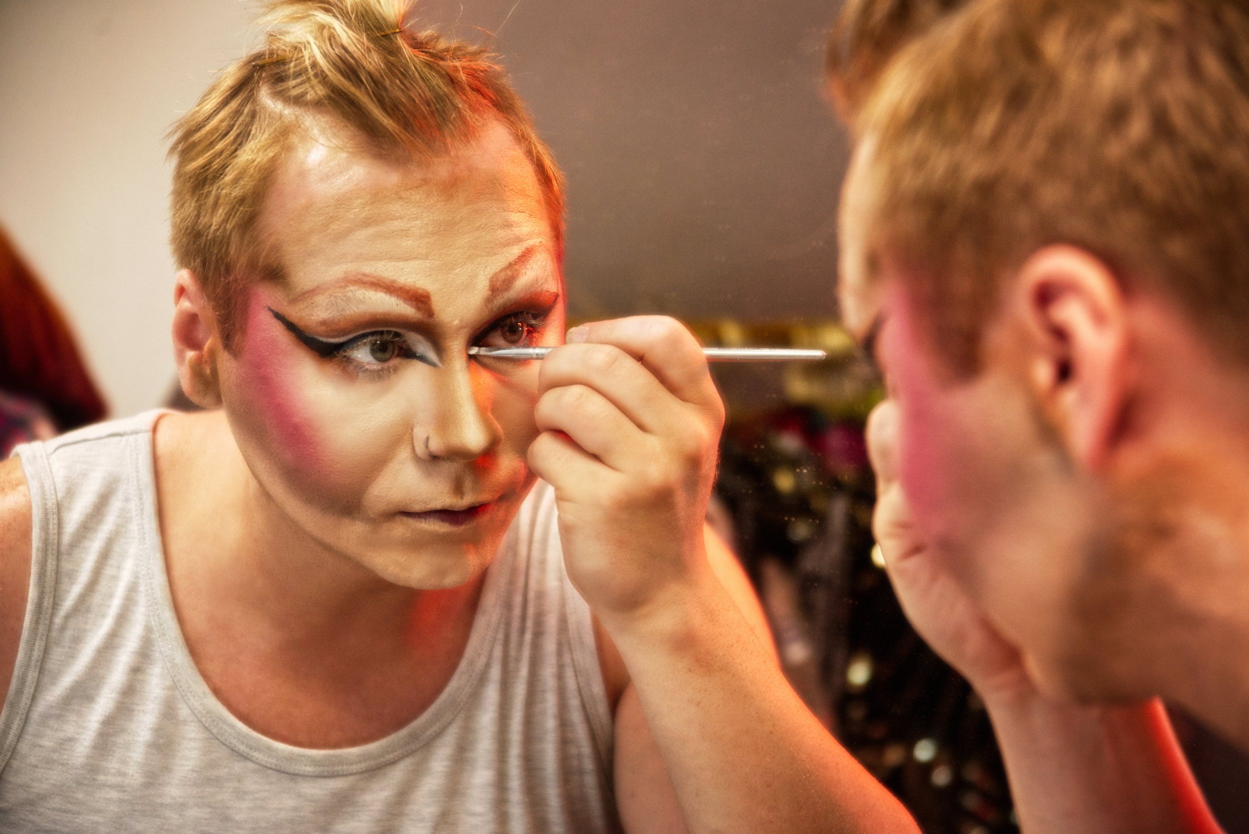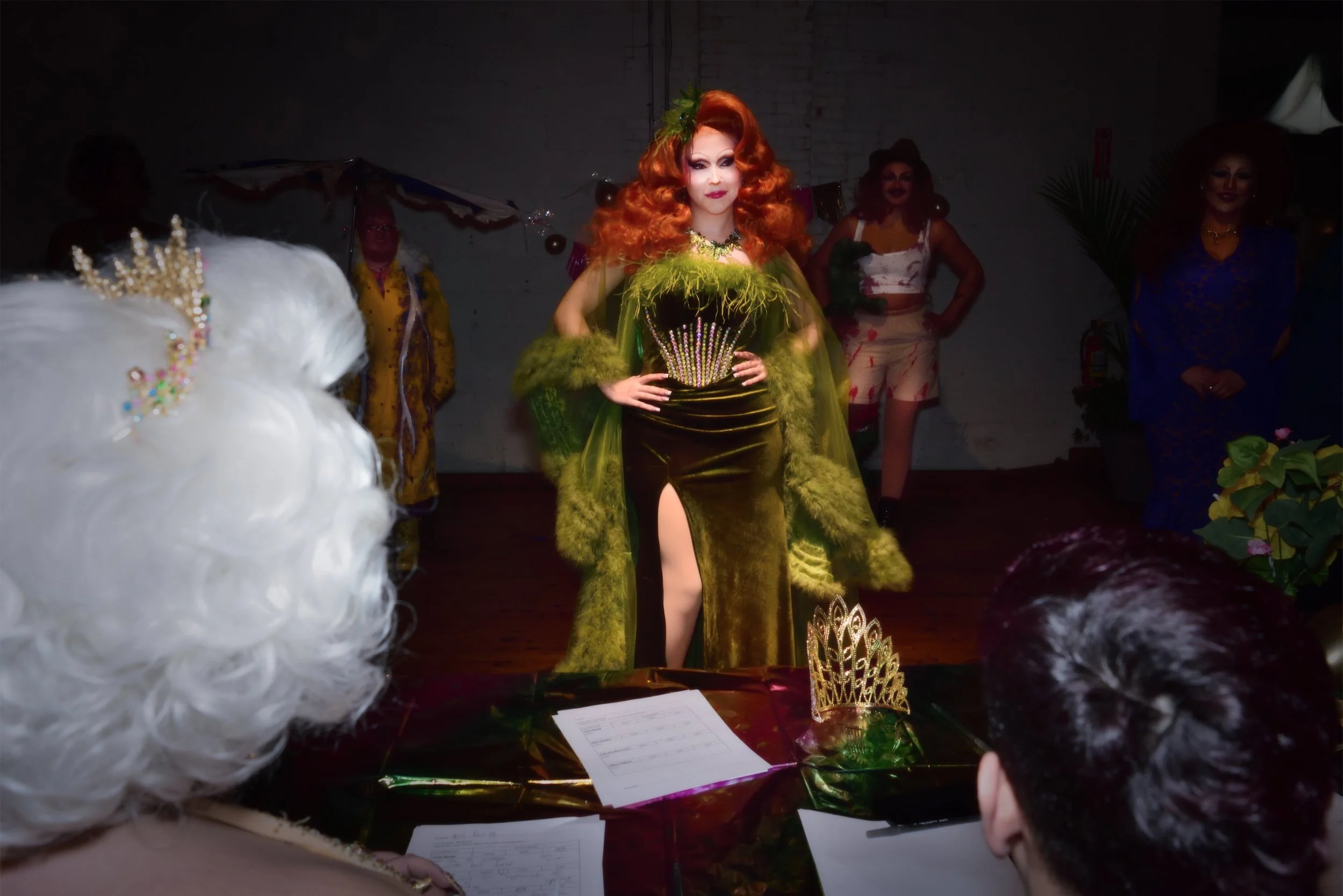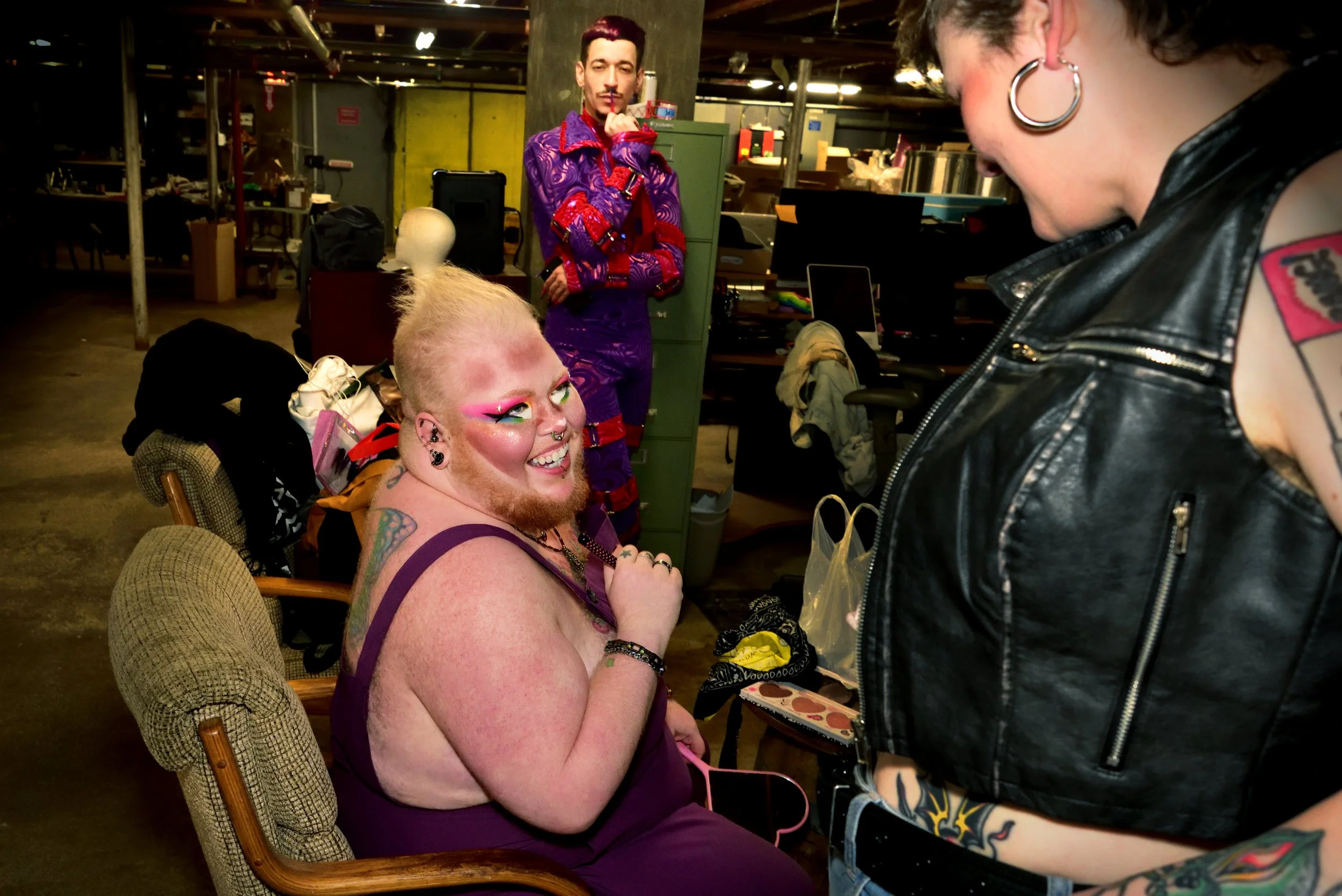 The photographs capture these subtle evolutions: mid-transformation portraits, fleeting expressions, and the physicality of emerging character. The process is iterative, requiring repeated stage appearances, experimentation, and audience feedback. Over time, gestures become more confident, nuances are refined, and the character gains depth. Each performer’s story is individually authored, yet performed within a community and facilitated by Awhora Borealis, who ensures space, consistency, and opportunity without imposing narrative control.