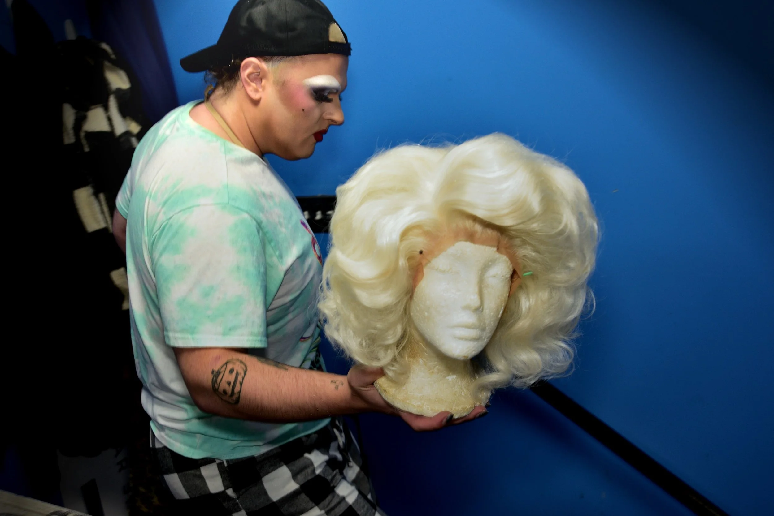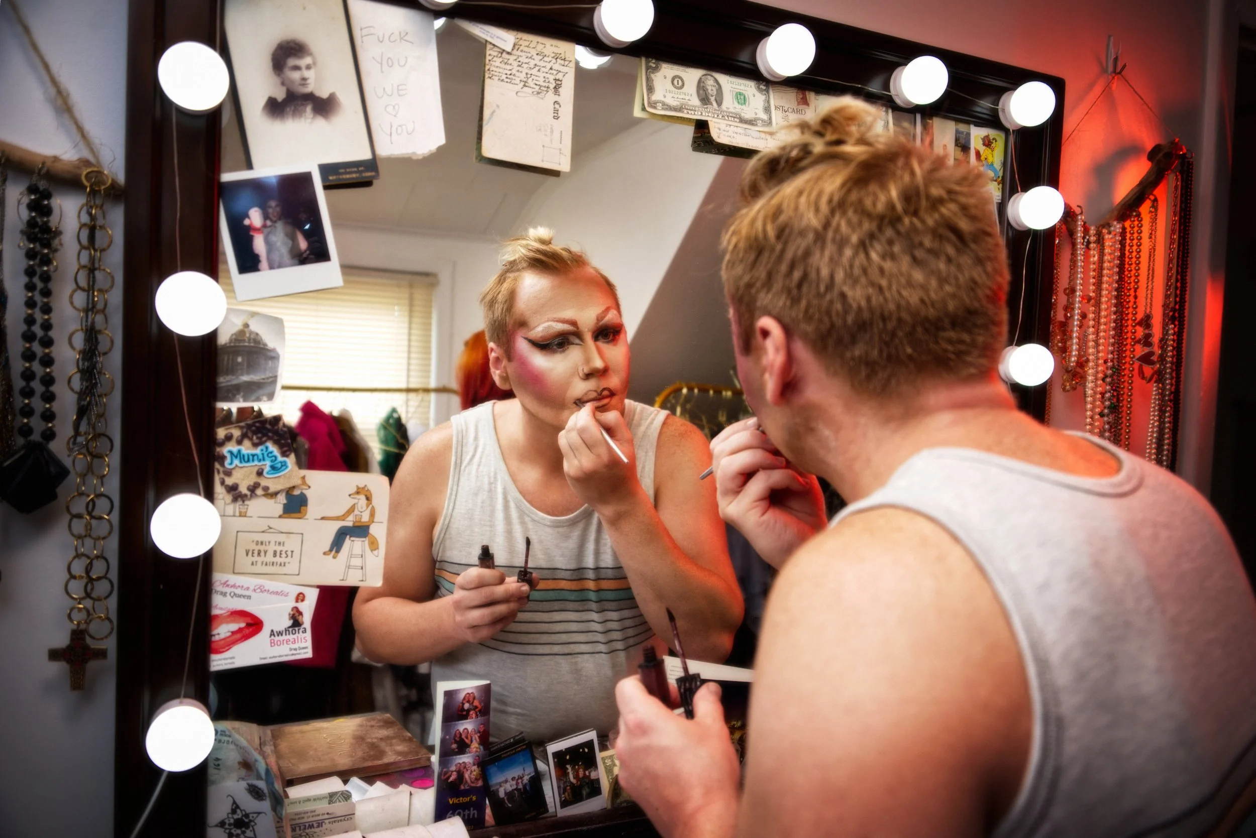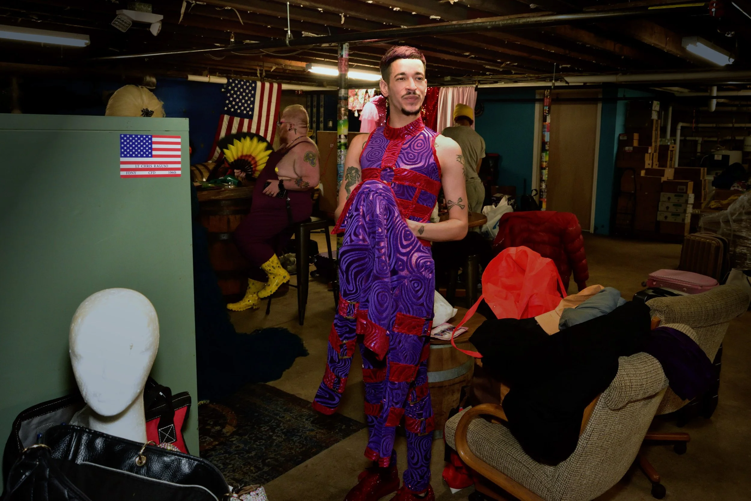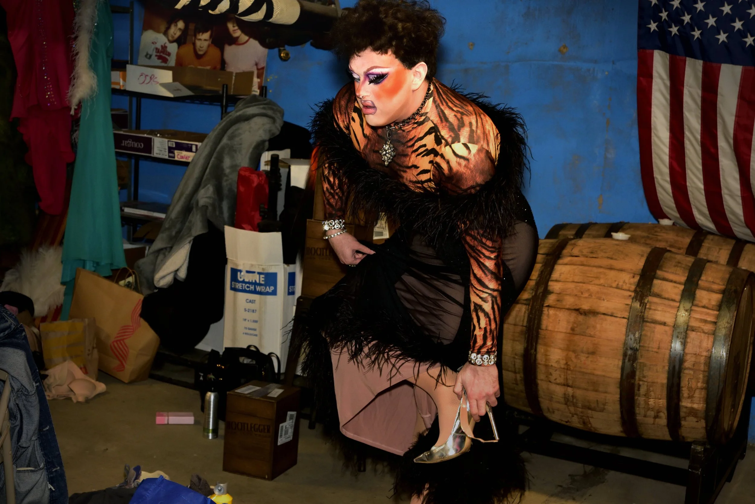 The photographs in this segment focus on detail and interaction. Makeup palettes, wigs, sequins, and costume textures become visual narratives in themselves, while performers’ hands, glances, and movements convey the intimacy and care of preparation. Recurring performers mentor newcomers, offering guidance while modeling professionalism and confidence. This mentorship is both practical and emotional, fostering trust and continuity within the community.