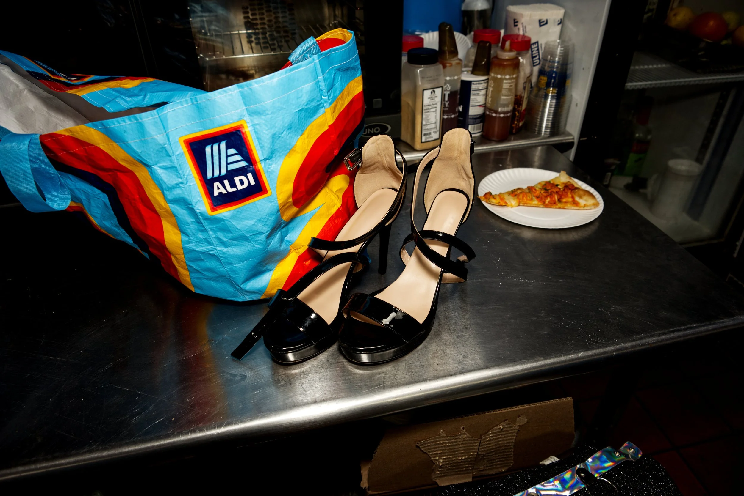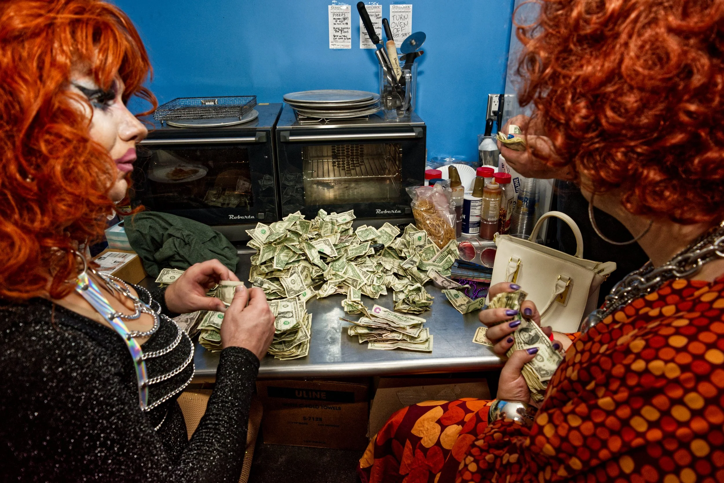 ANNIE MANILDOO, ALICE NOIR, and AWHORA BOREALIS count tips at the end of the night.